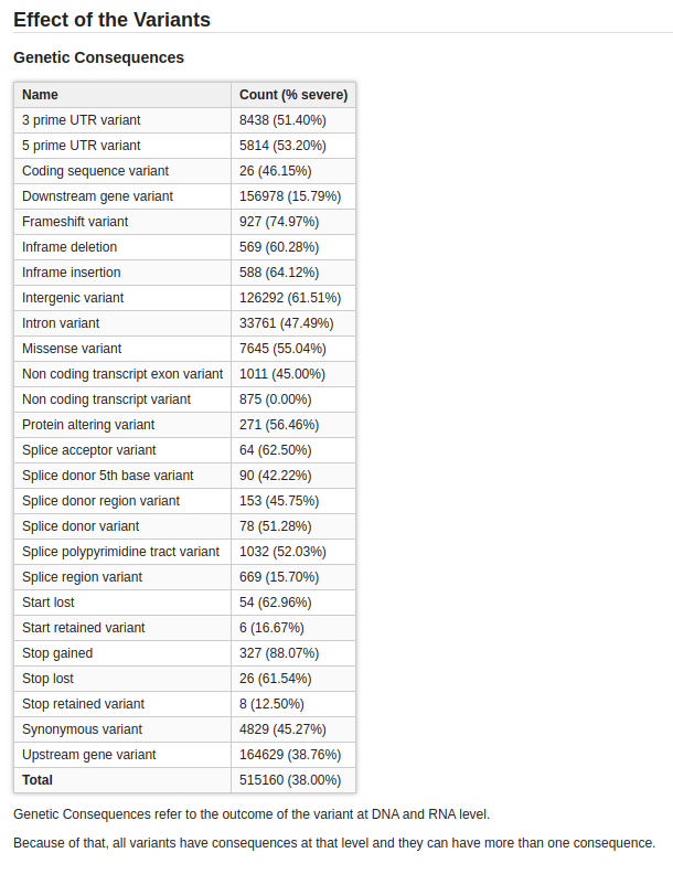 An overview of the effects of the variants both at the genetic and the coding level. In the case of the genetic consequences, the percentage of severe consequences is also disclosed. The most common severe consequences are: