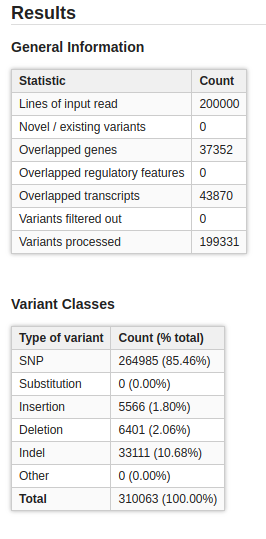 A general outline with a summary of the variant annotation job and the variant classes that were found in the VCF file. The job summary shows information about the process of annotation itself: