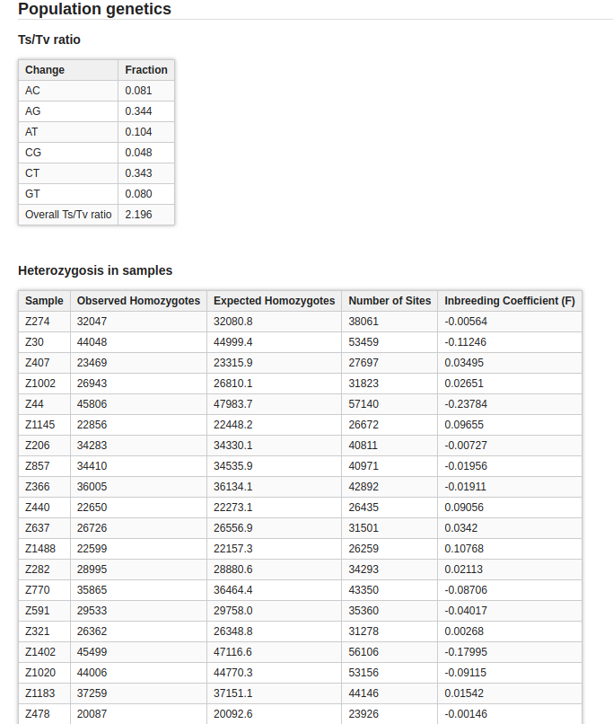 Population genetics statistics such as the transition/transversion ratio (Ts/Tv ratio) and a table with the inbreeding coefficient.