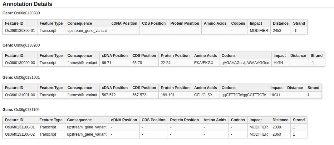 If you want more information about a variant, you can click with the right button the line of the variant and click in "Show Annotation Details". Then, an report will open with one table per gene affected by that variant. Each table will have one row per gene feature affected by that variant. That table will have the following columns: