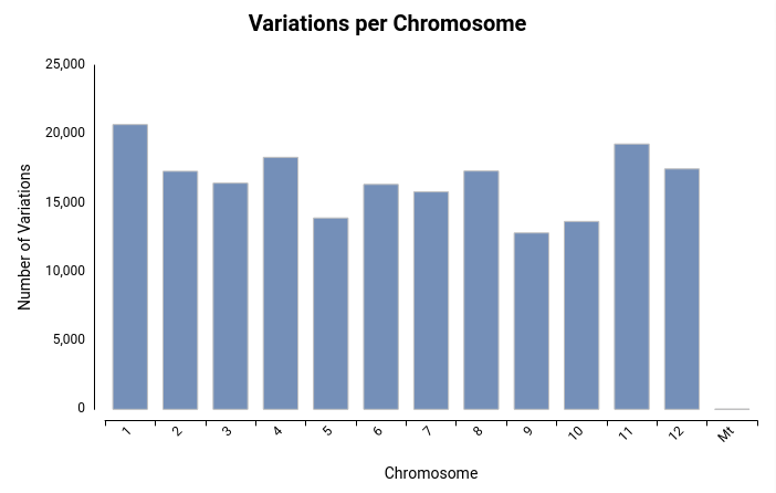 - Variants per Chromosome: this histogram should be even for all chromosomes. That means that all chromosomes have approximately the same number of variants.