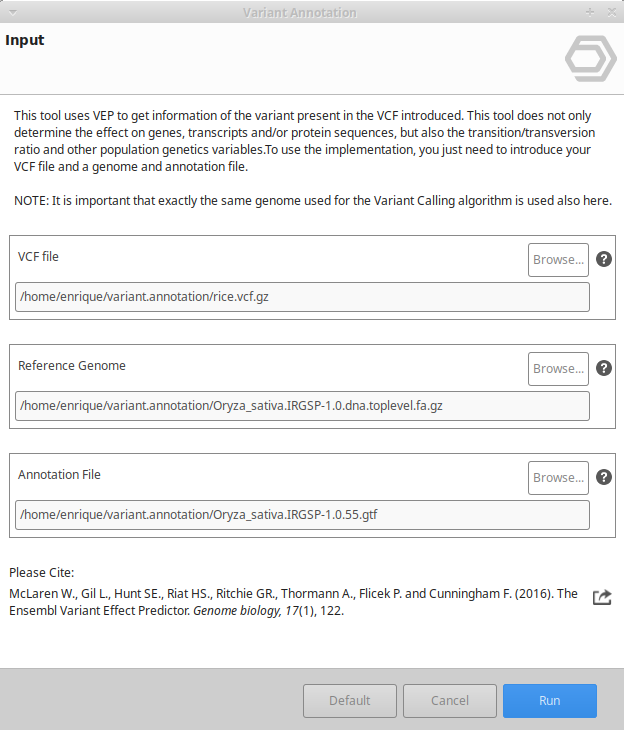 This tool can be found under Genetic Variation → Variant Annotation.The wizard consists of just one page to introduce some the inputs.