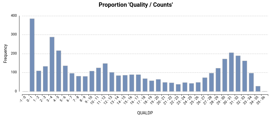Proportion 'Quality/Depth' Histogram: the quality column of VCF files is the Phred-scaled probability that the site has no variant. Nevertheless, it is better to rely on this quality normalized by depth.