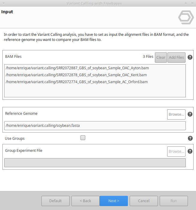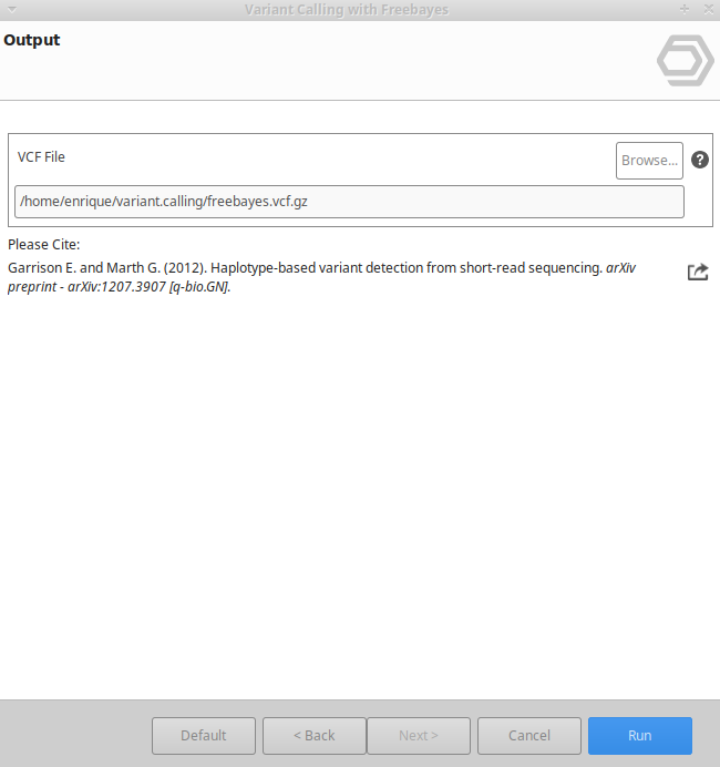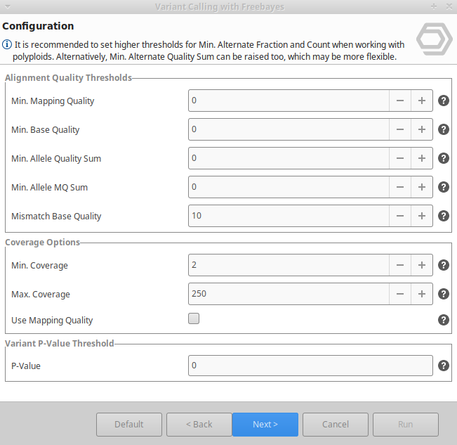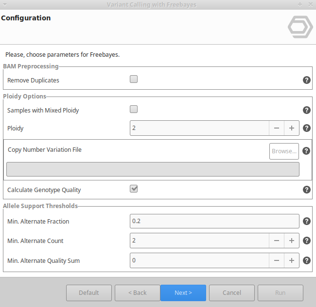 Freebayes can be found under Genetic Variation → Variant Calling → Freebayes.The wizard consists of 3 pages and allows to define the input and output options as well as the analysis parameters (Figure 2, Figure 3 and Figure 4).