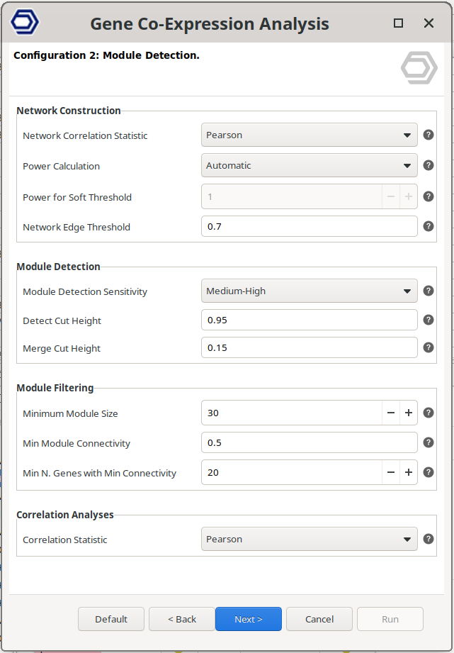 - Network Correlation Statistic. Specifies the method used to calculate gene–gene similarity distances. Pearson correlation is the standard choice, while Biweight Midcorrelation (bicor) provides increased robustness to outliers.