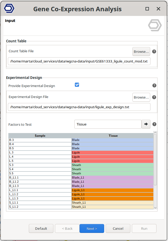 - Provide Experimental Design. Check this option to provide an experimental design. It will be used to associate experimental conditions with co-expressed gene modules.