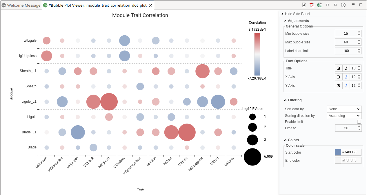 The color scale and the minimum and maximum bubble sizes can be adjusted in the Module Size Panel.