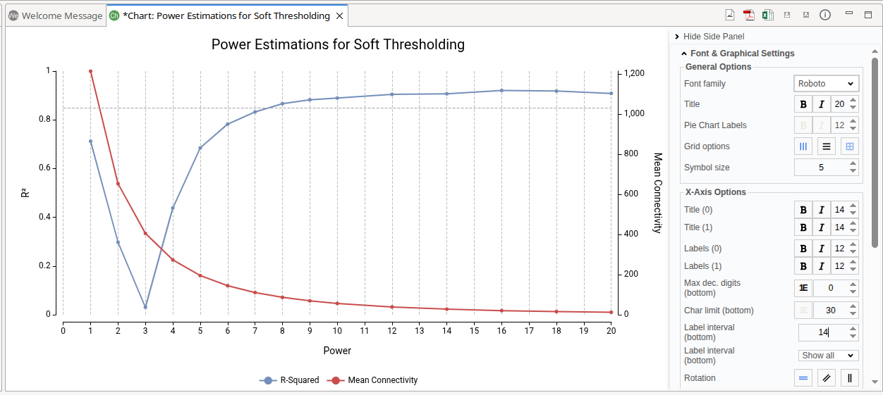 In practice, the selected Power is usually the lowest value at which the R² curve reaches a high level (commonly ≥ 0.85) or begins to plateau. The dashed grey line marks the R² 0.85 value. Choosing the smallest power that satisfies this criterion helps preserve meaningful biological relationships while reducing noise.