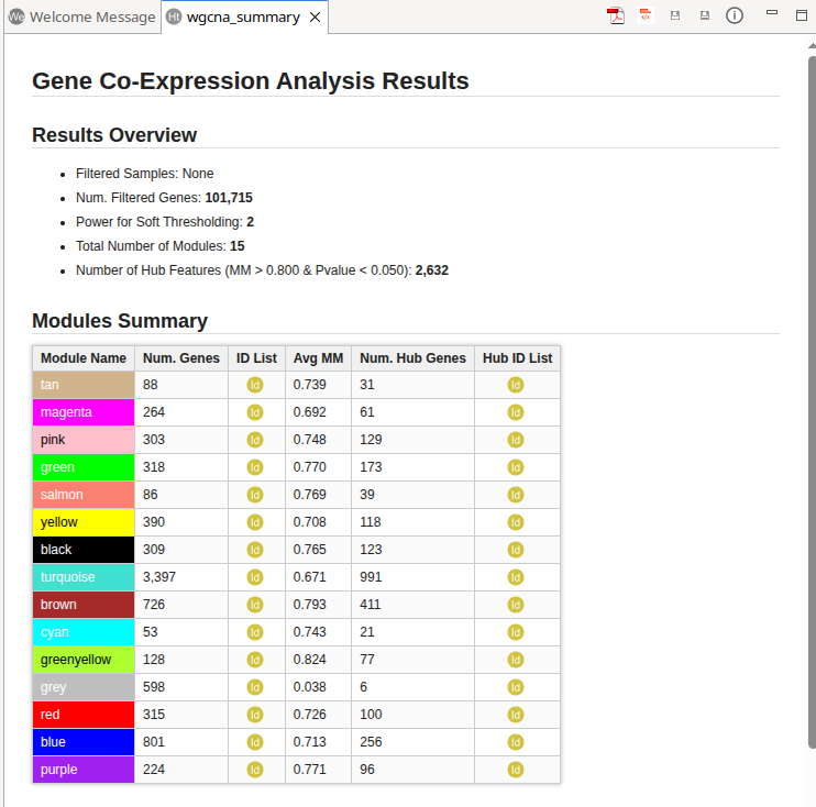 The Main Viewer displays the primary results of the WGCNA analysis in a table format (Figure 4). Each row represents a single gene. Only genes that passed the filtering steps are included.
