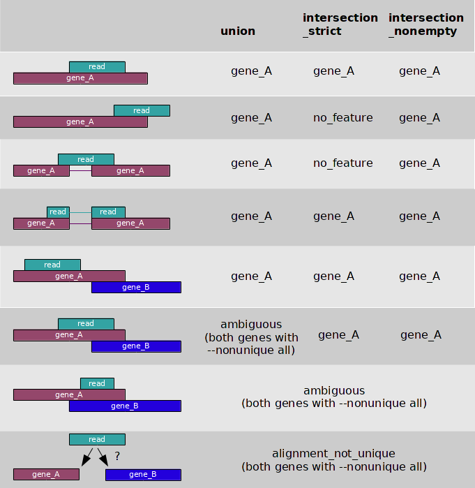 Overlap Mode:Modes to handle reads overlapping more than one feature. Consider that for each position in the read, a set of all features overlapping is defined. If the resulting set for a read (or read pair) contains precisely one feature, the read is counted for this feature. If it contains more than one feature, the read is counted as "ambiguous" (and not counted for any features), and if it is empty, the read is counted as "no feature". The three overlap modes join these sets as follows (Figure 5 illustrates the effect of these three modes):