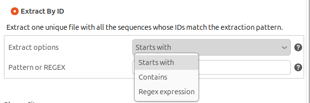 - Extract By ID: Extract a single file containing all the sequences whose ID matches the extraction pattern. The extraction pattern is defined using regular expressions, and there are 2 predefined extraction patterns: