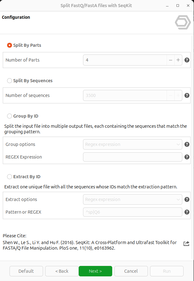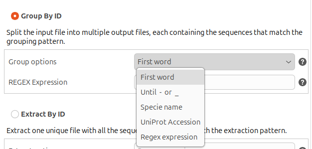 Group By ID: Split each input file into multiple output files, each containing all the sequences whose ID matches the grouping pattern. The grouping pattern is defined using regular expressions, and there are 4 predefined grouping patterns: