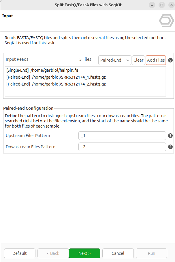 It is possible to provide multiple files at once to apply the same splitting operation to all of them, including a mix of FastQ and FastA files. For each input, it is necessary to specify whether it is single-end or paired-end. The paired-end option is only available for FastQ files, and the suffix of both files must match the pattern described below.